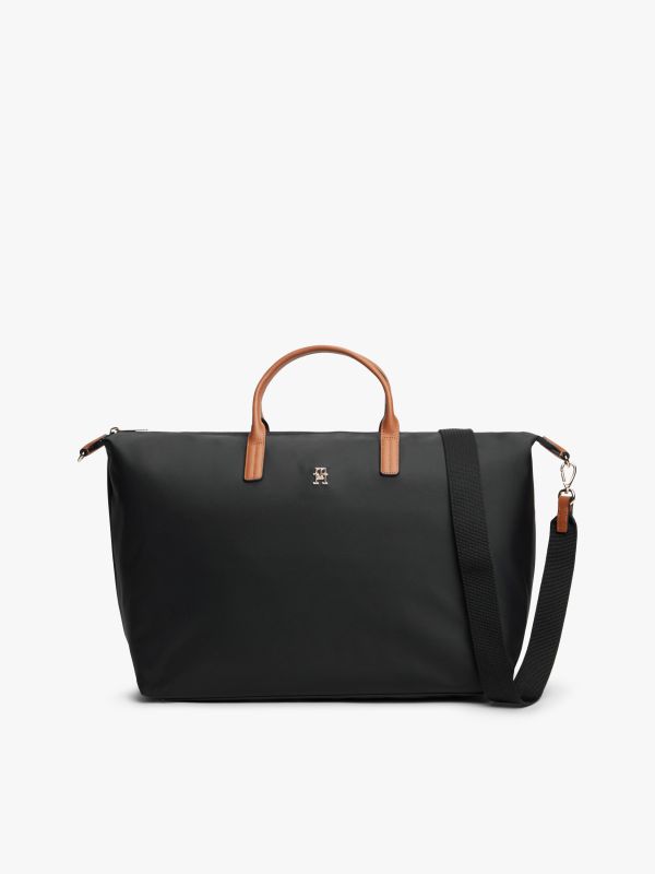 • Nylon blend • Zip closure • Two contrast top handles • Removable crossover webbing strap • One main compartment • TH monogram plaque on front • Tommy Hilfiger branding