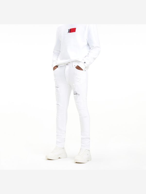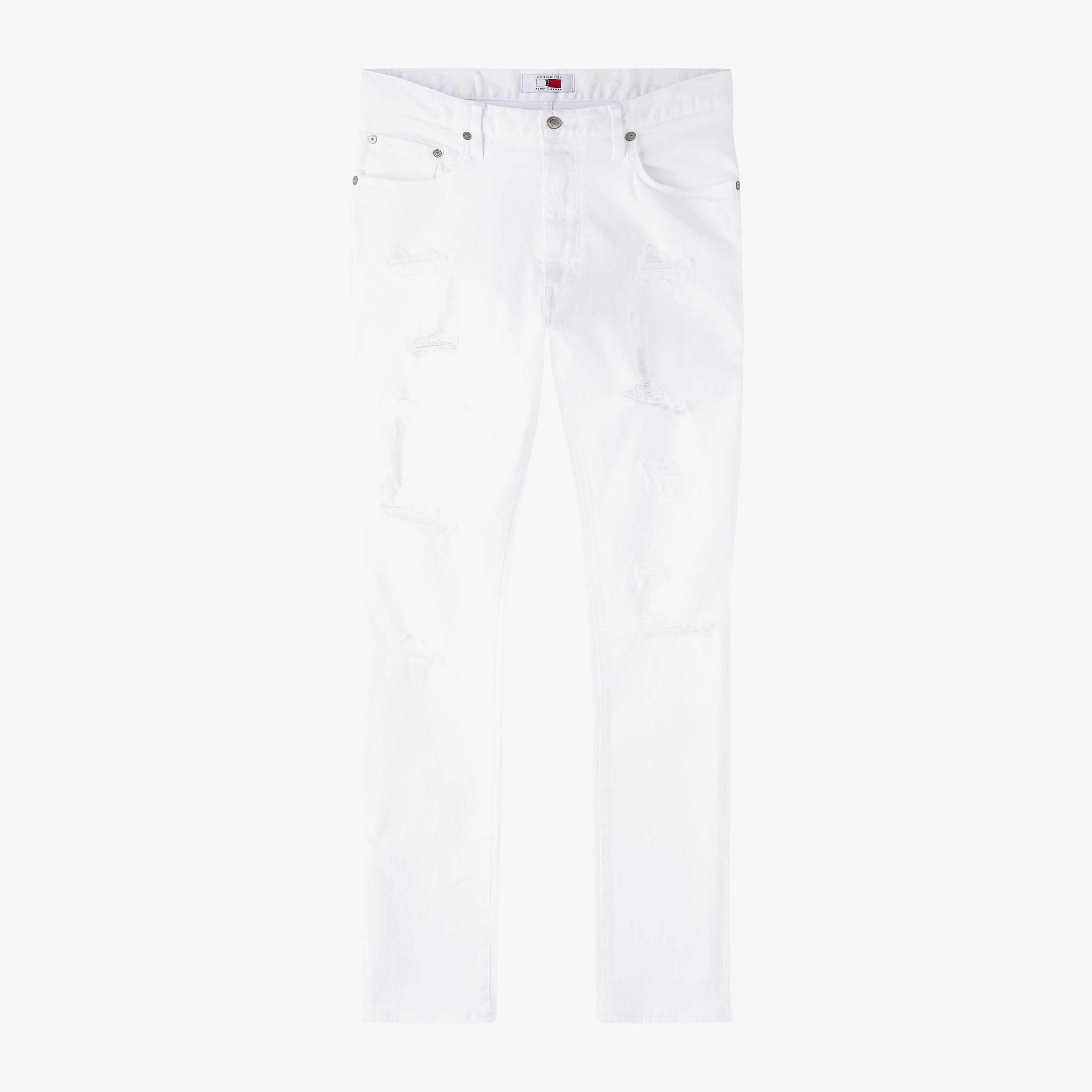 • Stretch cotton denim blend • Distressing at thighs, knees and back pockets • Zip with button closure • Five-pocket styling • Branded button • Lewis Hamilton x Tommy Hilfiger logo patch on waistline