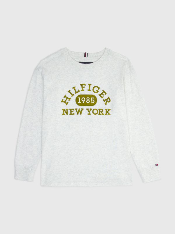 This long-sleeved tee with a bold collegiate-inspired logo on the front is perfect choice for in-between weather days.