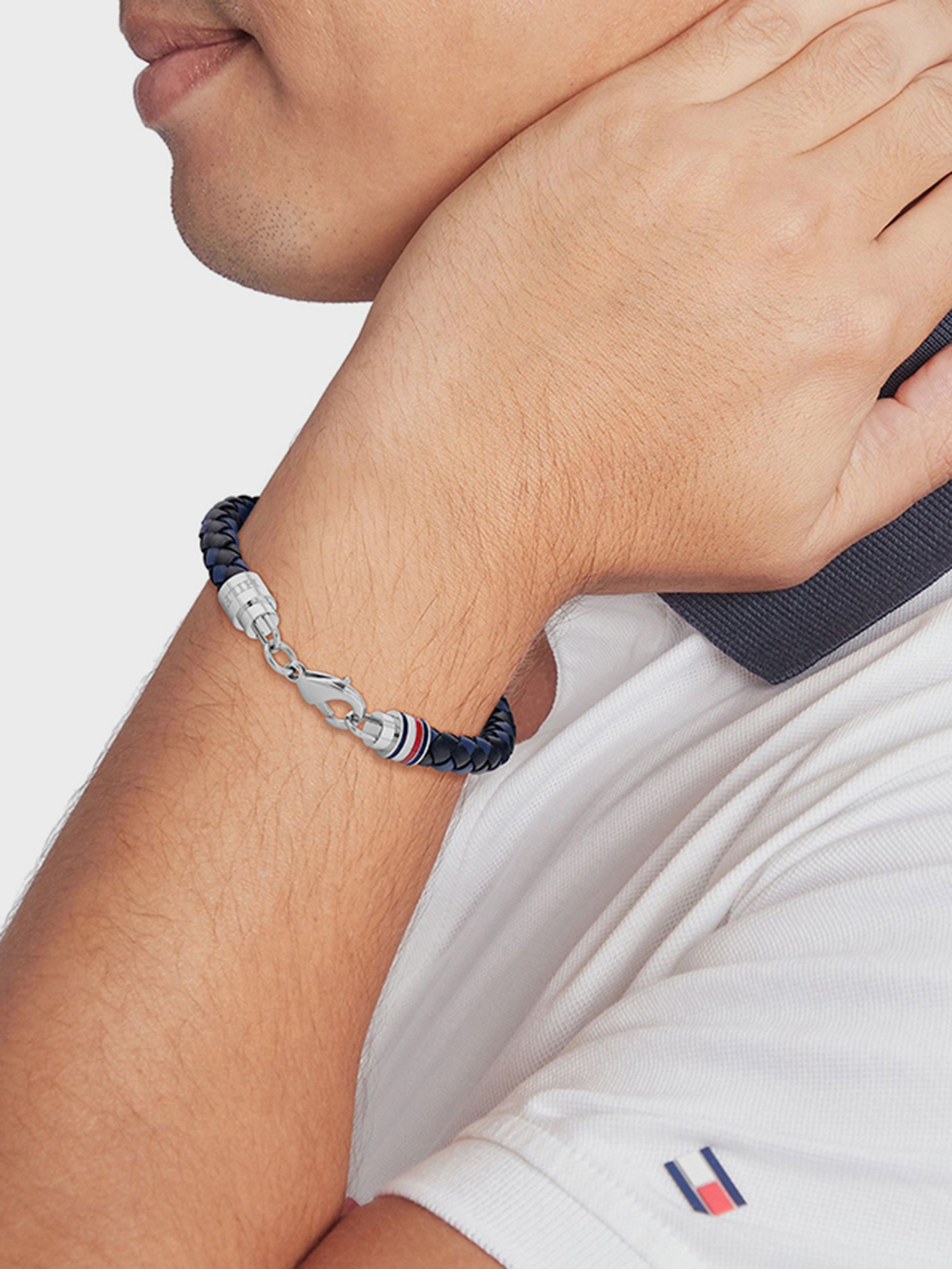 The Tommy Hilfiger men’s bracelet is easy-to-wear and denim-friendly, perfect for casual style. Featuring iconic enamel corporate stripe branding, a lobster closure for a secure fit, and a genuine leather braided strap, it’s the ultimate accessory for effortless, laid-back cool.