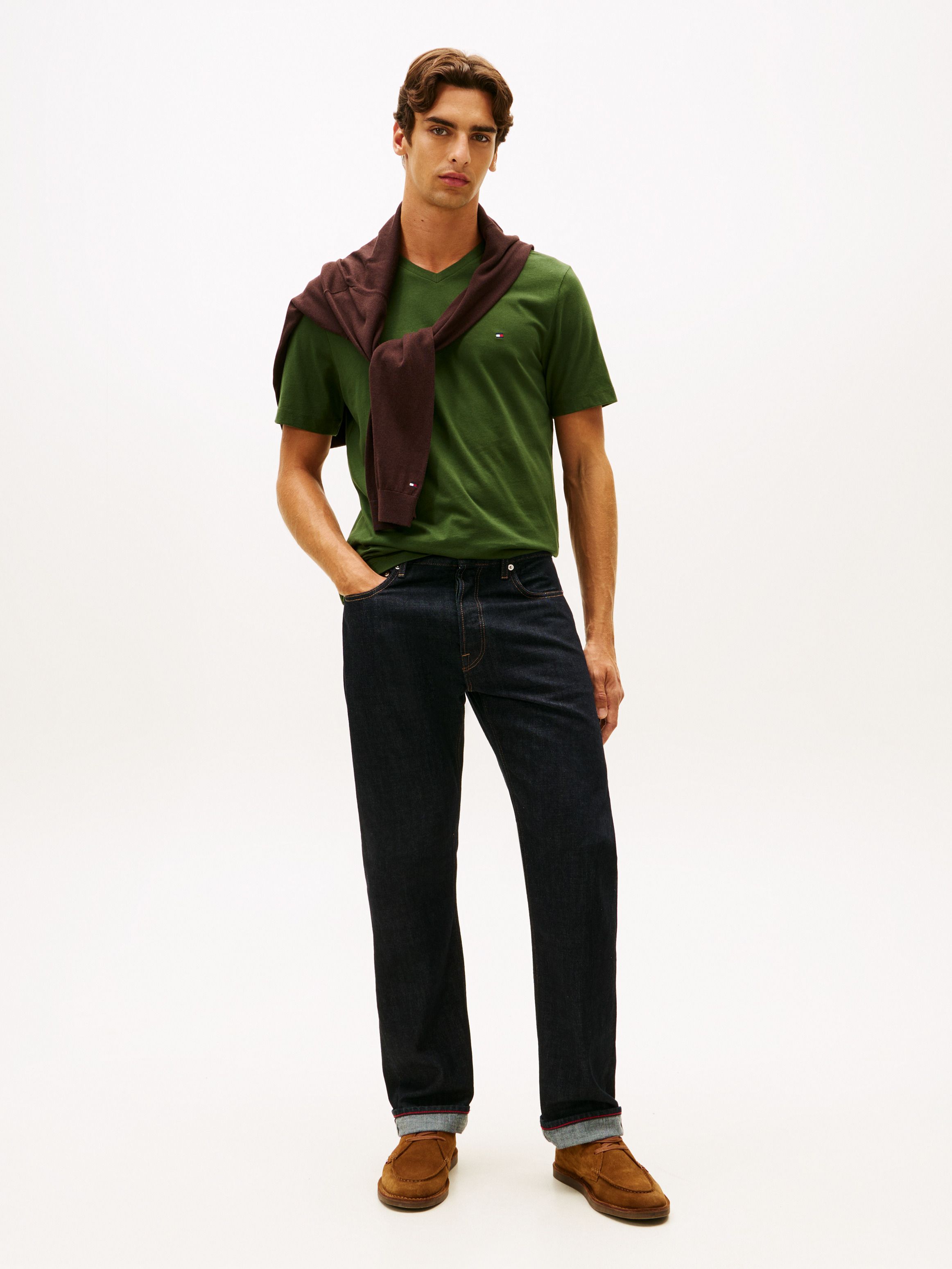 Go for a timeless look with his V-neck tee, crafted from pure cotton and finished with an embroidered flag logo.