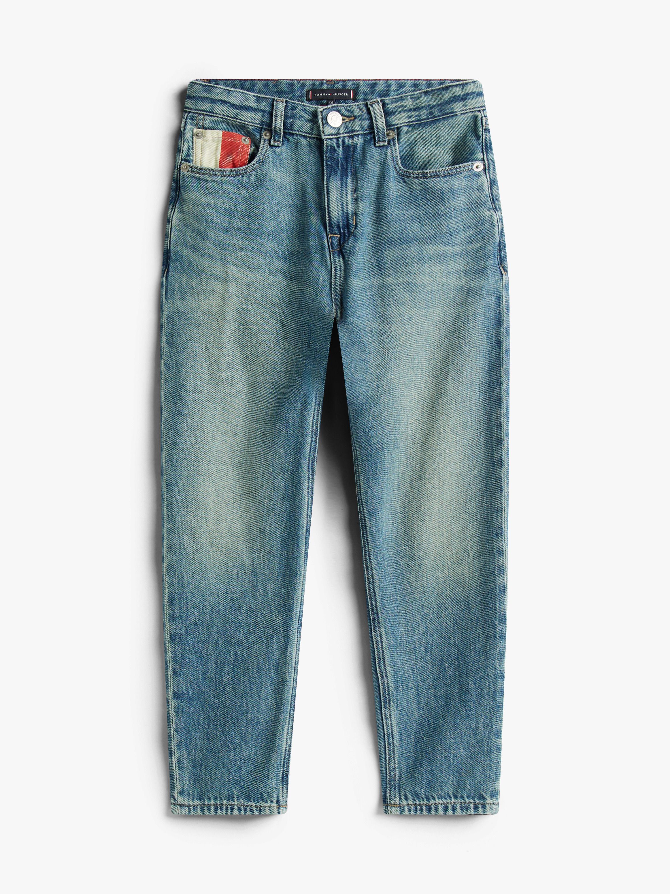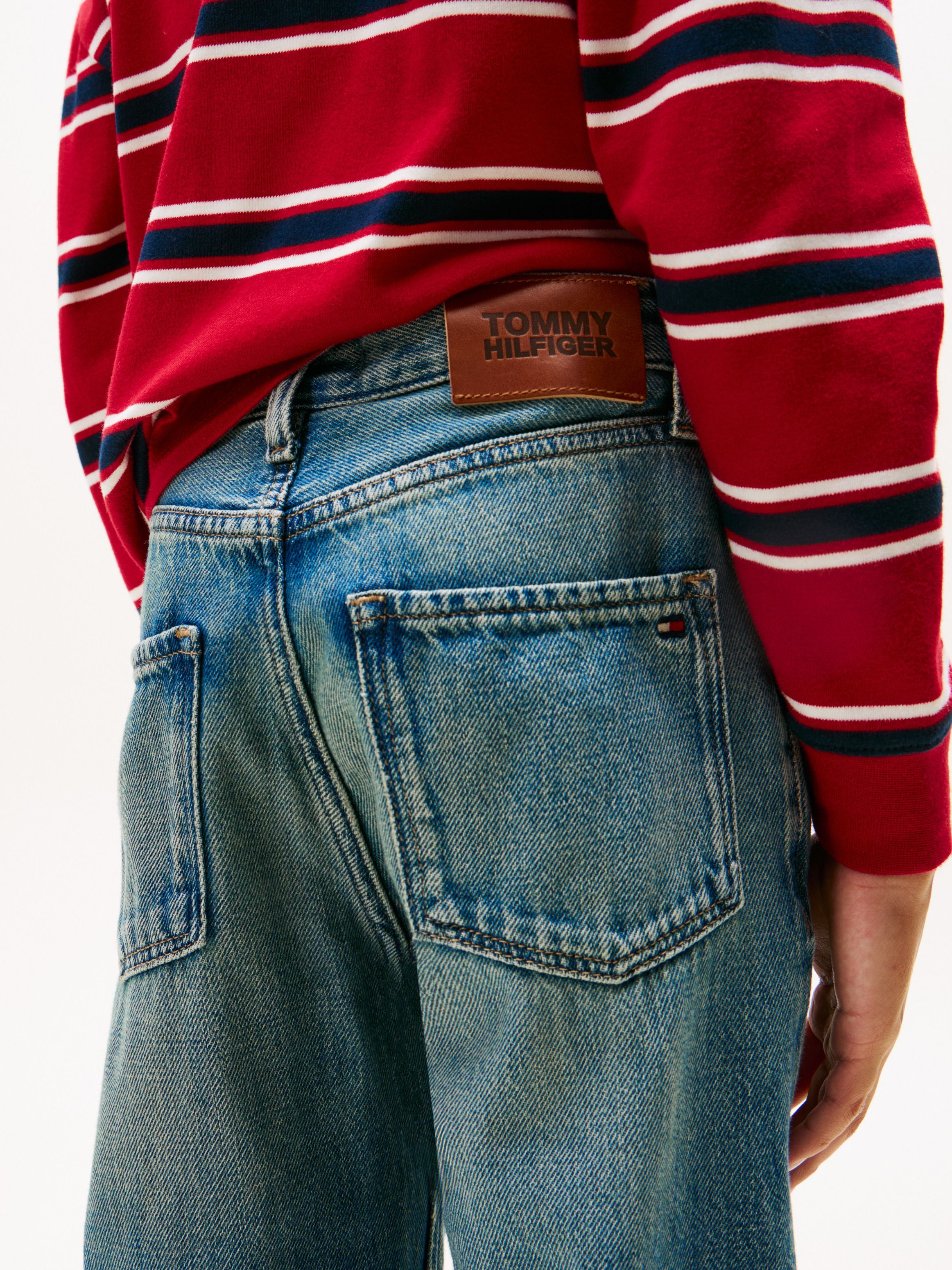 • Rigid denim • Vintage wash • Whiskering on front • Fading on thighs and knees • Zip with button closure • Five-pocket styling • Tommy Hilfiger flag on coin pocket • Tommy Hilfiger branding • Tommy Hilfiger flag embroidery on back pocket
