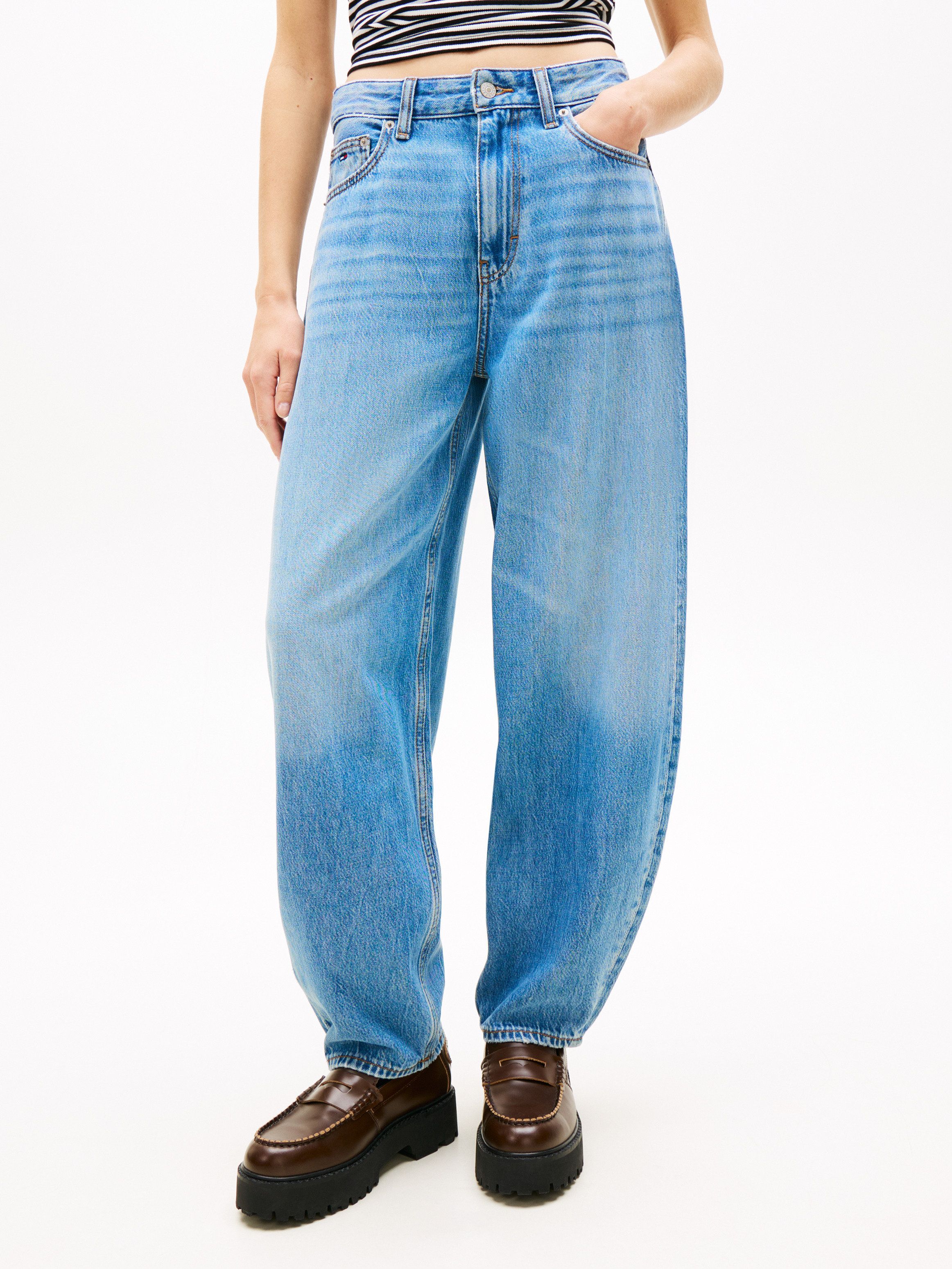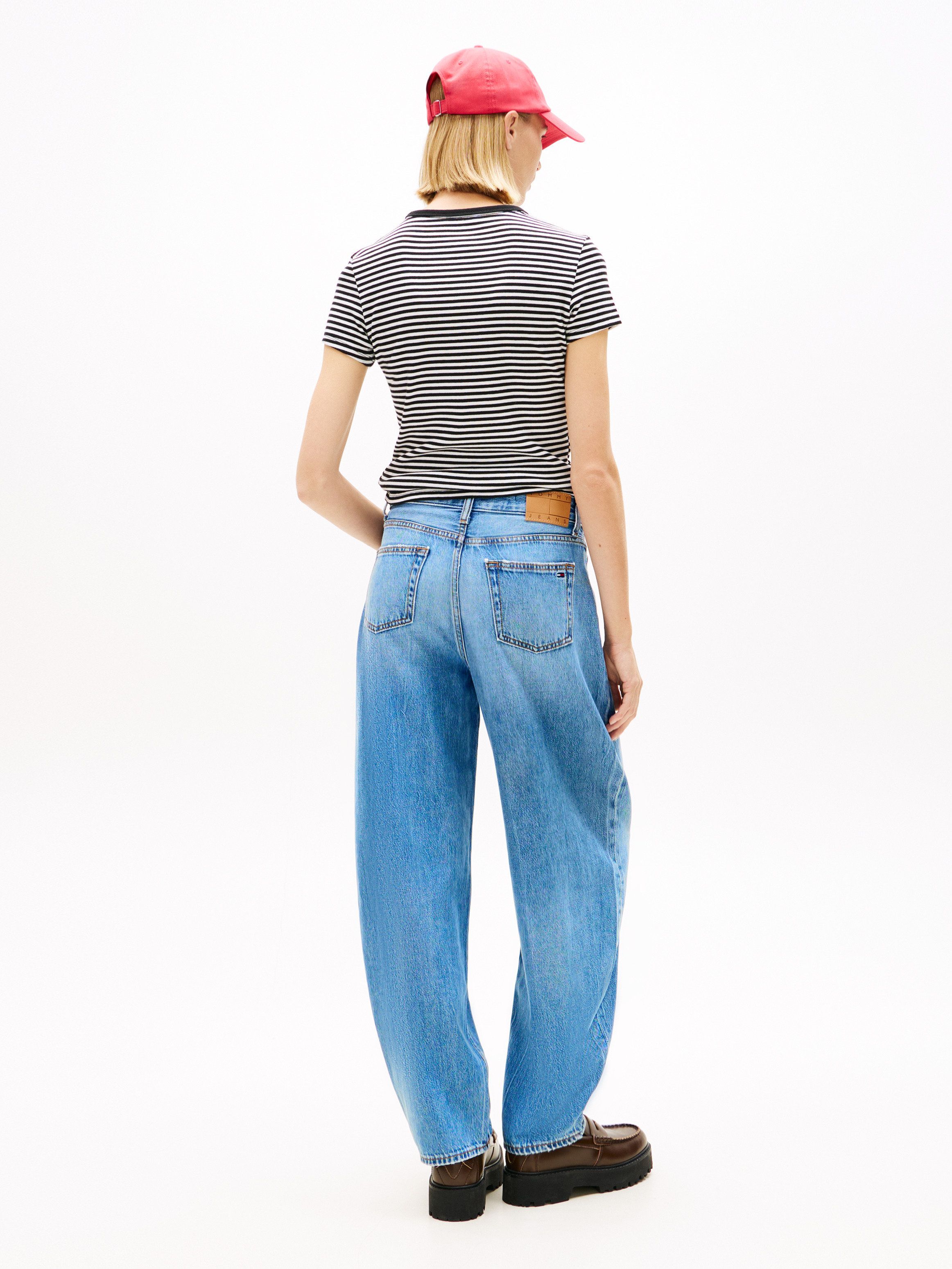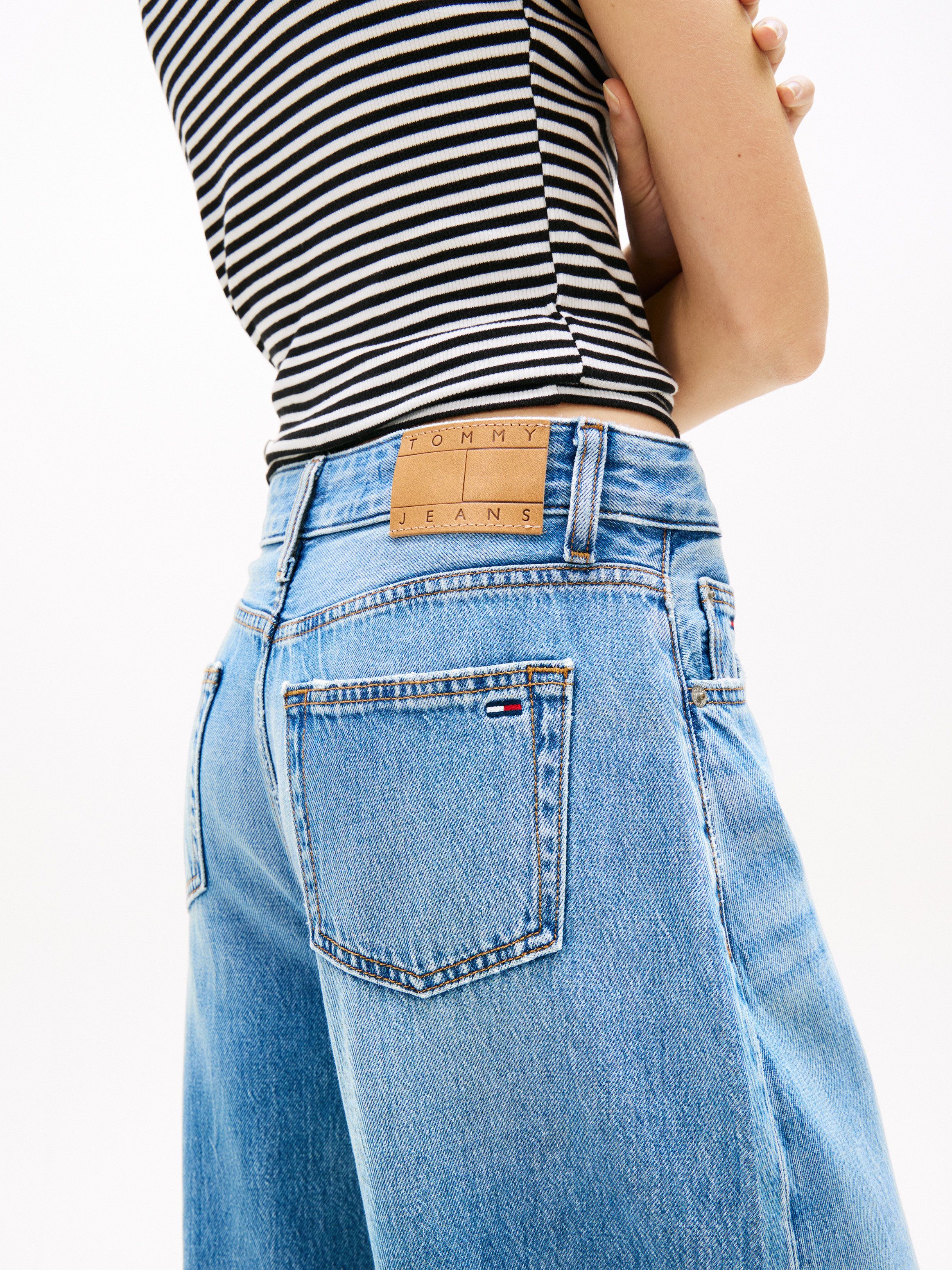 • Cotton blend denim • Whiskering on front • Fading on front and back • Zip with button closure • Five-pocket styling • Branded metal button and rivets • Tommy Jeans branding • Tommy flag embroidery on coin and back pockets