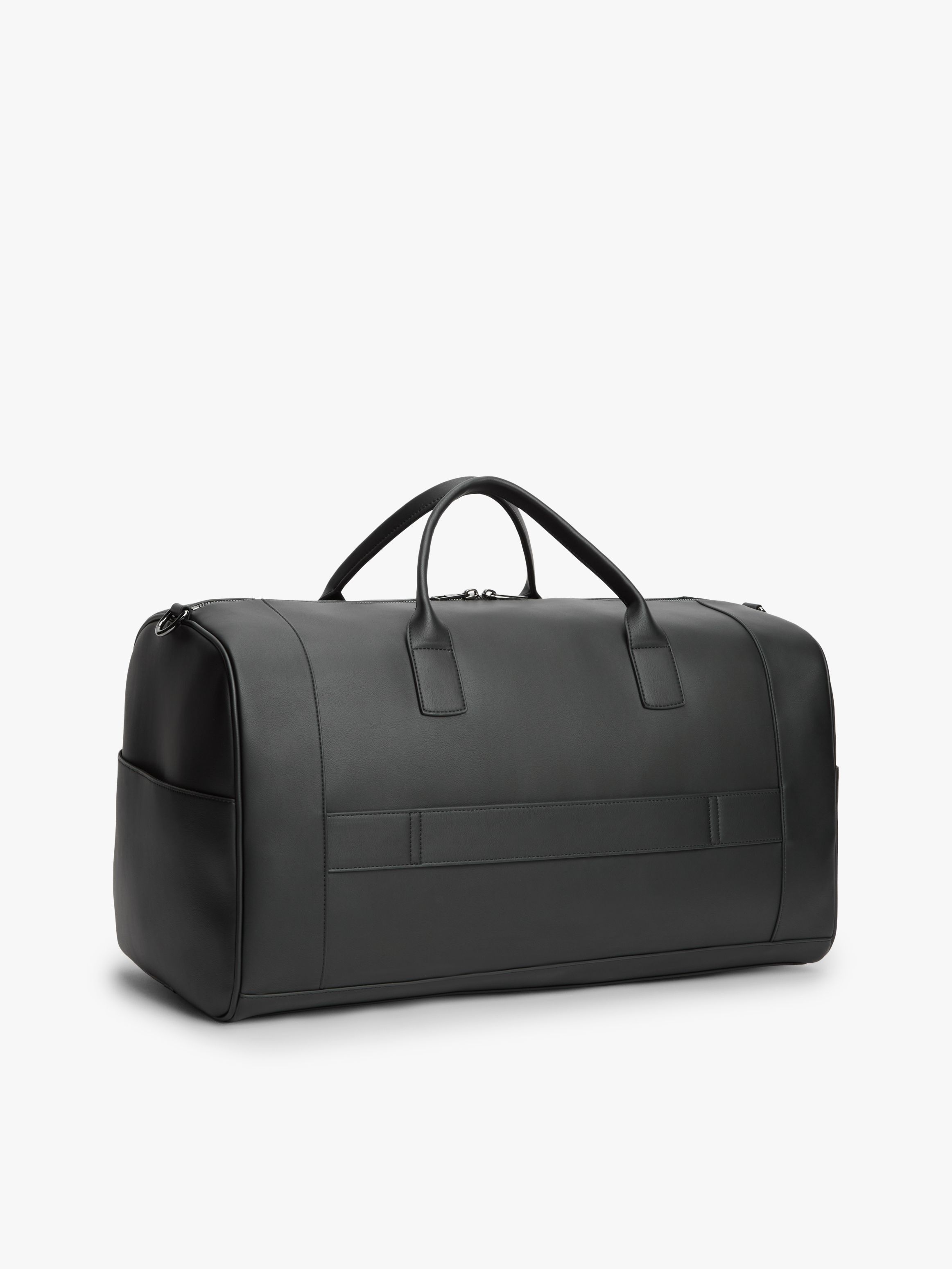 Travel in style with this duffel bag, showcasing generous proportions, sleek branding and a sophisticated mix of smooth and woven textures.